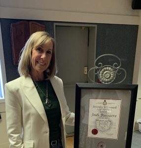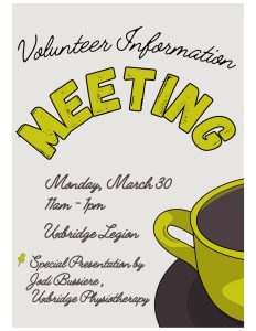 Monday, March 30 the UHA volunteers welcomed Jodi Bussiere of Uxbridge Physiotherapy. After all reports were read, we were treated to coffee and homemade muffins and a presentation from Jodi which encompassed her multi-faceted career volunteering at the Olympics, the Pan Am Games and even the Run for the Diamond! Pictured, is Jodi standing beside her Queen Elizabeth II Platinum Jubilee Volunteer Award.